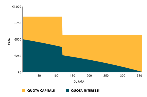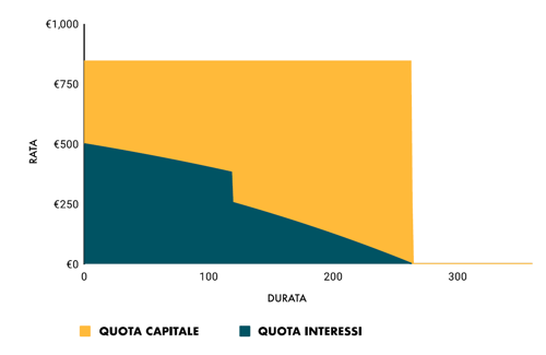 Questo meccanismo è rappresentato nel grafico sotto: la rata rimane identica, mentre la durata si accorcia e la parte complessiva di interessi (l’area ottanio) si riduce, perché una parte del piano di ammortamento viene eliminata.