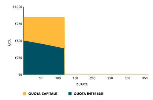 Per questo, il piano di ammortamento si presenta come nel grafico sotto: la rata è sempre la stessa (circa 843 euro) lungo tutta la durata del mutuo (360 mesi), ma la quota di interessi (area blu) si riduce nel tempo, mentre la quota capitale (area gialla) cresce gradualmente.